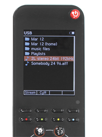 Pictured at right is a Cyrus remote control with the player's music menus legible a small bright screen.